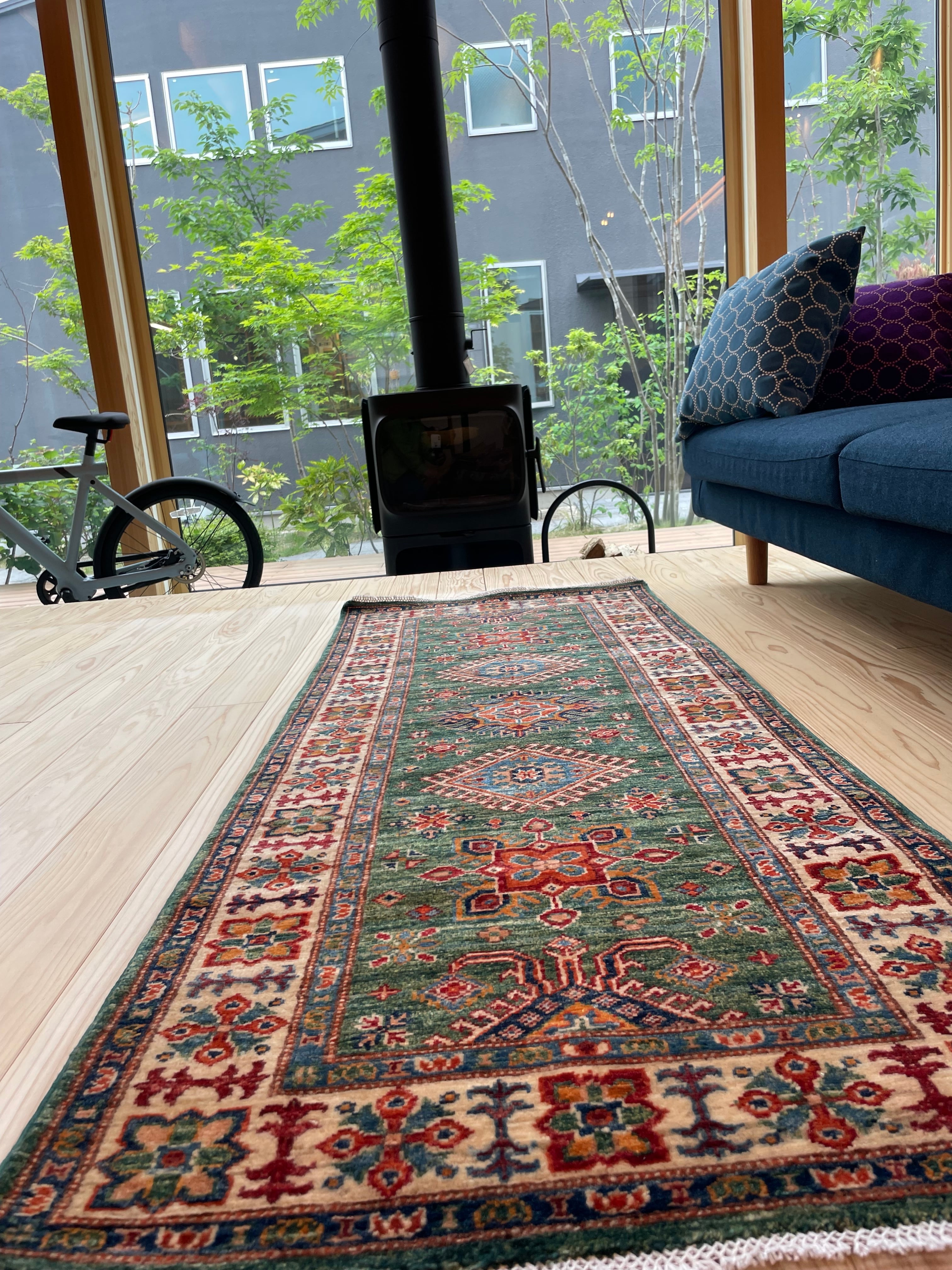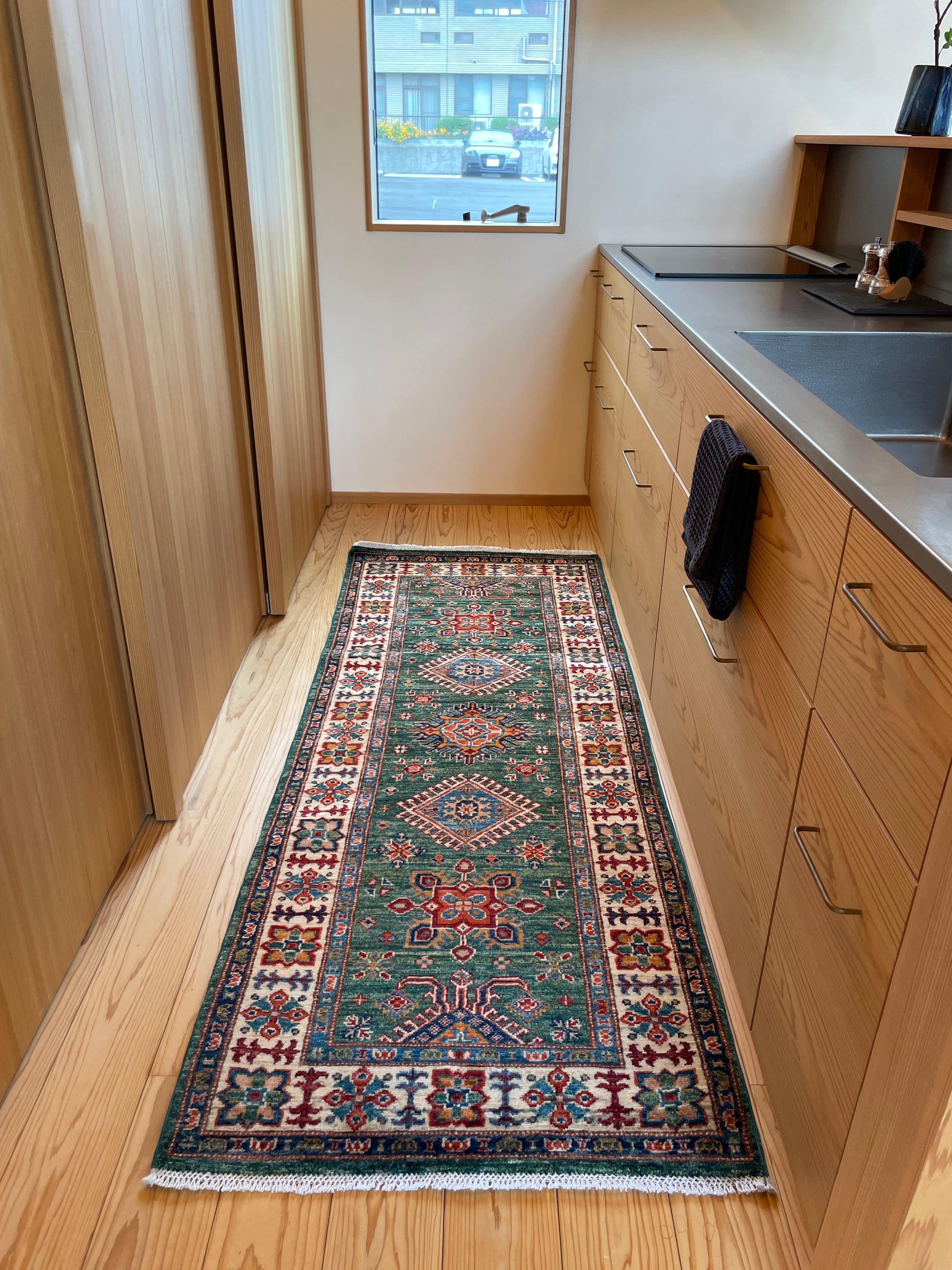 モダンなインテリアとも調和するデザインのため、リビングやダイニング、玄関などさまざまな空間で活躍します。このアフガンランナーを取り入れることで、空間に特別な温かさと個性を加えることができるでしょう。